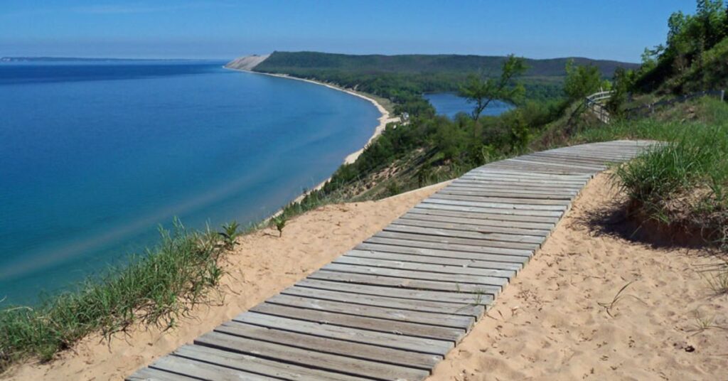 Several scenic stops allow travelers to step out and take photos of Lake Michigan and rolling sand dunes. One famous stop features a steep dune slope that drops toward the lake below. Many visitors walk partway down the sand but must climb back up carefully.